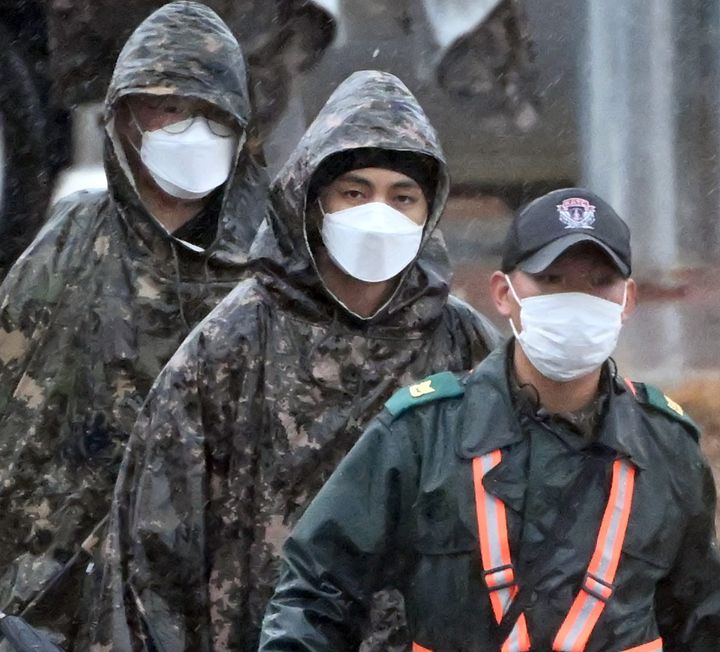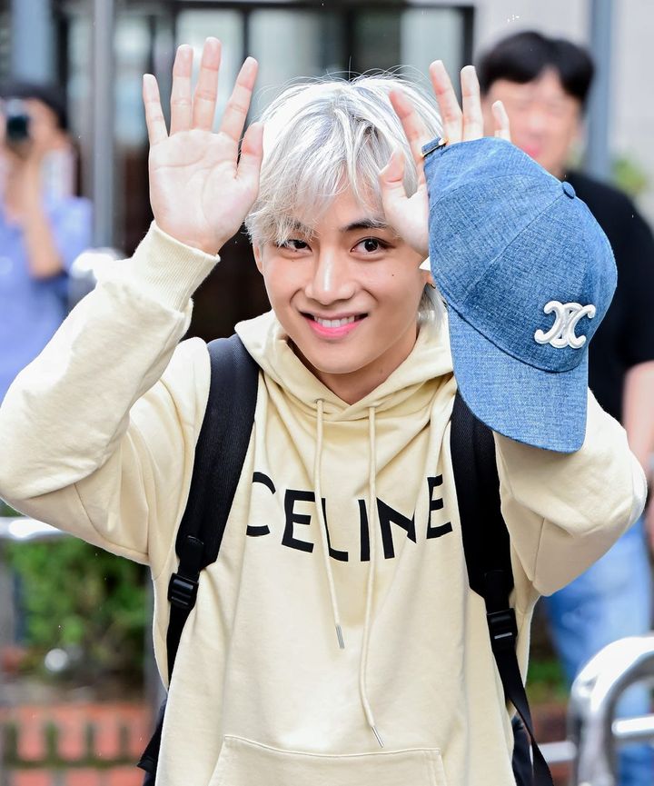 最年長メンバー、ジンの除隊を記念してBTSメンバーが大集合! Vは自身がアンバサダーを務める「セリーヌ」のニット帽を目深に被った姿で登場。マスクを着用しているため、表情が見えないものの、日焼けした肌と大きくなった体からヘルシーな健康状態が伺える。