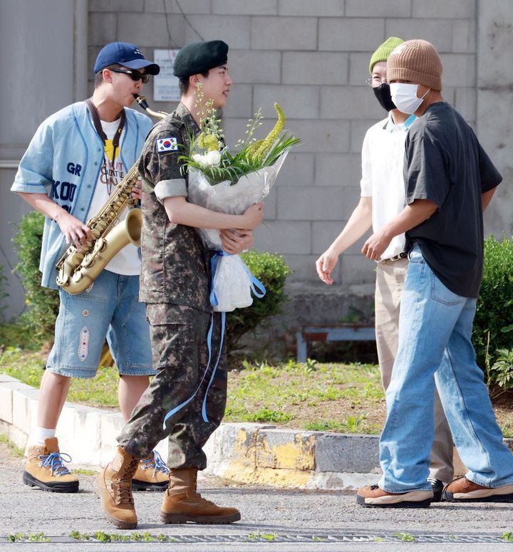 一緒に除隊したRMとともに。チャーミングな笑顔と、Vらしい茶目っ気は健在♡
