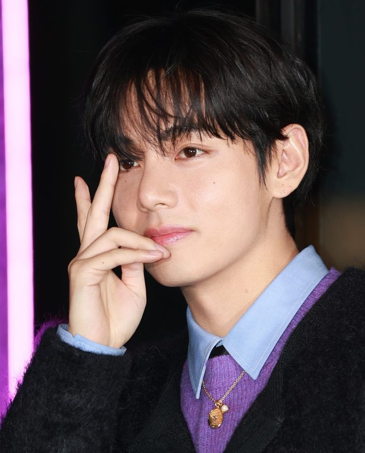 ソウルで開かれた「セリーヌ」のポップアップストアオープニングイベントにて。みずみずしいツヤ肌とピンクリップでフレッシュなメイクに。メイクとは対照的に、ヘアはウェットな質感のパーマヘアで色気を出し、「セリーヌ」が似合う大人な男性に。