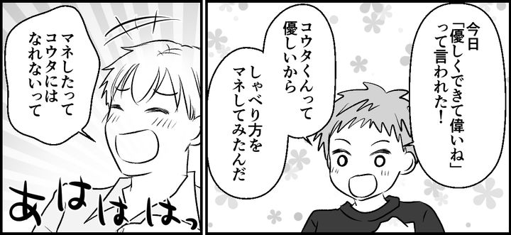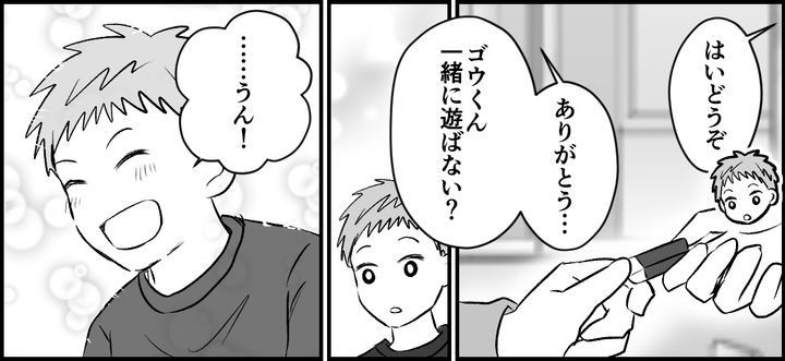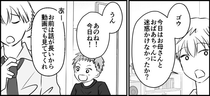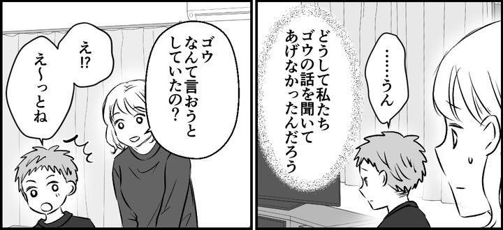 「あのね、今日ね!!」と話そうとするゴウの言葉を旦那は遮りました。シュンと落ち込むゴウ。今までは私もゴウにこんな顔をさせていたのかもしれません。私はゴウにもう一度話を聞かせてほしいと言いました。するとゴウは目を輝かせて、今日あったことを話してくれました。