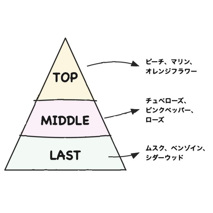 香りのピラミッド層で見ると想像しにくいのですが、一言で表現するとフローラルです。甘い系は苦手な私なのですが…、何故かこの香りは特別!!ローズ系だけではなくムスクやシダーウッドのどっしりとした香りが入ってるのもポイントですね。お勧めしてくれた美容師さんも同じ感想で、本当に、、一度でいいからお試しいただきたいです!