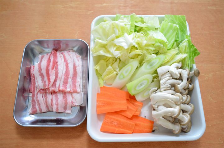 1. キャベツは5cmほどのざく切り、にんじんは5cm長さの薄切り、長ねぎは斜め切り、しめじは石づきを取ってほぐしておく。豚肉は7cmほどの長さに切る。