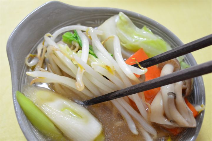 4. 再び沸騰したら、キャベツ、にんじん、しめじ、長ねぎを入れる。火が通ったらもやしを加え、サッと煮たら出来上がり。