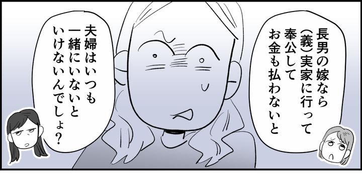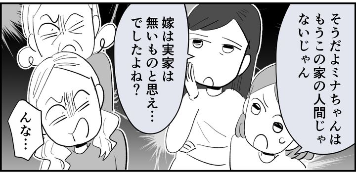 「夫婦は一緒に帰省」「義実家に奉公しろ」これが、義母のルールです。義母の言う「嫁のあり方」を、ミナちゃんがしていないことを私たちは指摘しました。「ミナちゃんだって長男の嫁なんだから、実家には帰れないはずなのに、なんでミナちゃんがこの家の予定を決めて、一緒にいるの? 旦那さんの実家に急いで行ったほうがいいよ?」