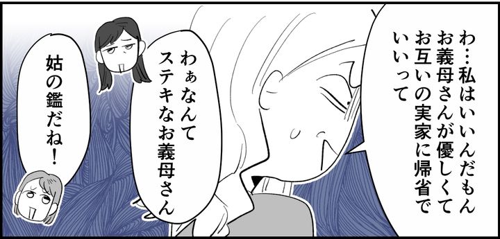 それでも「お義母さんが優しくて、セパレート帰省でいいって言うんだもん」と、あくまでも自分を肯定するミナちゃん。「わぁ、なんてステキなお義母さんなのかしら! 姑の鑑だね! でも実は、心の中は違うかもしれないよ? 行ったほうが絶対にいいよ!!」と私たちが追撃すると……