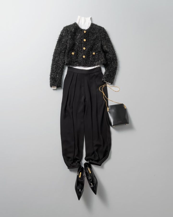 職場の忘年会は1年の締めくくりとして普段あまり交流のない人たちとも顔を合わせる機会だから、きちんと感はキープしつつ自分らしさも纏っていたい!そこで、金ボタンが華や見えして短丈でトレンド感もプラスできるブラックのジャケットカーディガンを主役に、無難すぎない一癖モノトーンコーデで好感度を引き寄せて。パンツのシルエットや統一感のあるゴールド金具もポイントに。