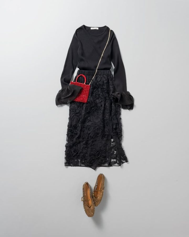 女子会パーティでは華やかさはもちろん、程よいヌケ感も意識したい! 一見地味になりそうな黒×黒でも袖の大胆なフリルとシックな花柄レーススカートの掛け合わせなら華やいだ印象をキープしつつパーティの高揚感もプラス。オールブラックに差し色の赤とゴールドが映えて年末ムードを後押ししてくれそう。