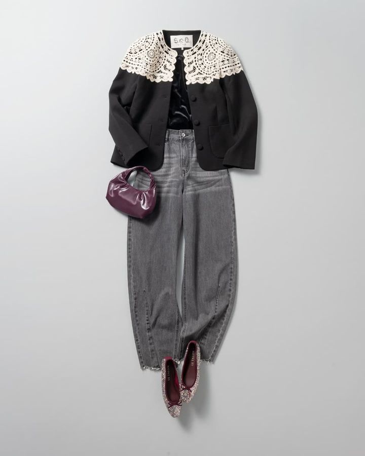 地元に帰省したタイミングで旧友たちが集うプチ同窓会では、気張らないホームの安心感だけじゃなく、久々に会うからこそきちんと更新してる感も意識したい!ゆるシルエットのグレーデニムに注目トレンドのレースをあしらったジャケットが普段着の洗練度を高めてくれそう。さりげないバーガンディの差し色が絶好のスパイスに。
