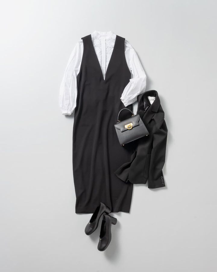 義実家への帰省はきちんと見えを最優先に、楽に動けるリラクシーな装いを意識したい。全体をモノトーンでまとめてきちんと感をキープしつつ、体型を拾わず締め付けもないジャンパースカートなら移動時間もストレスフリー!ブラウスのさりげない花柄レースがおしゃれ心を満たしてくれそう。