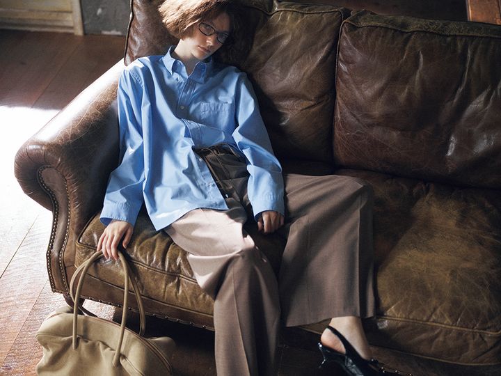 ベージュパンツ/ebure(LITTLE LEAGUE INC.) ブルーシャツ/へリーハンセン(ヘリーハンセン 原宿店) 眼鏡/ミュウミュウ(ルックスオティカジャパン カスタマーサービス) ベージュバッグ/モフィオラ(アマン) パンプス/SLY(バロックジャパンリミテッド)