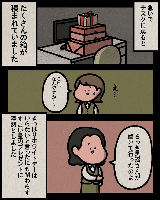 デスクに積まれたプレゼントの山。義理チョコだからお返しはいらないと伝えたはずが…/身の毛がよだつゾッとした話