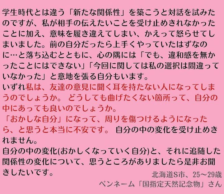 今回はそんな、自身のこころの変容に戸惑っている方からのお手紙のようです。