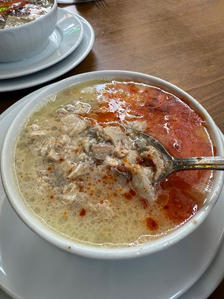 早速、看板メニューの「İşkembe Çorbası(イシュケンベ・チョルバス)」と「Kelle Paça(ケッレ・パチャ)」を注文。運ばれてきた「イシュケンベ・チョルバス」はシチューのような白濁したスープに細かくした仔牛の胃袋が入っています。