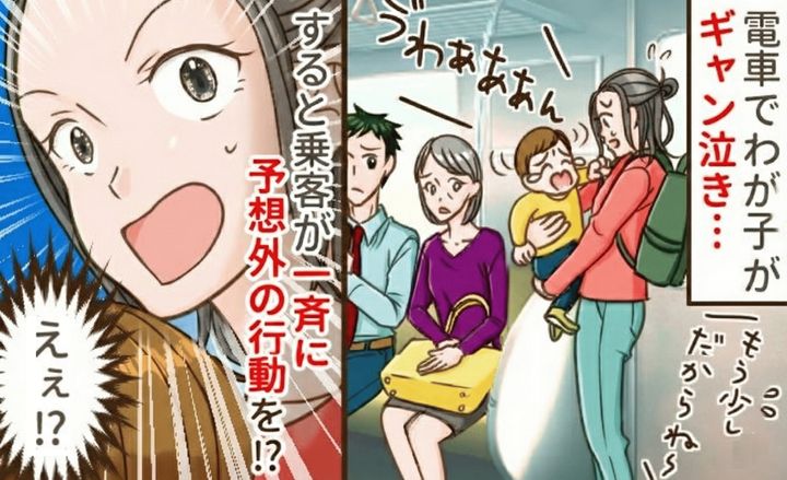 子どもが1歳のころ、電車の中で急に泣き出してしまいました。周りの視線が痛いと感じて、次の駅で降りようかと考えていたとき、ある女性の言葉がきっかけで乗客が一斉に思いもよらない行動を……!?