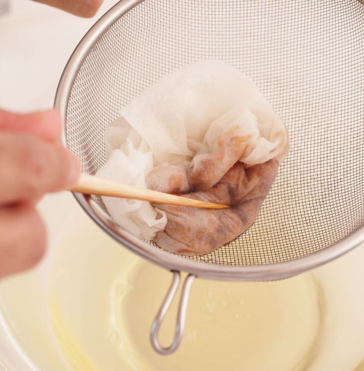 (3)だし汁が色づいたら、厚手のペーパータオルを敷いた万能こし器をボールに重ねてこし、粗熱を取る。そばつゆ用に2と1/2カップを取り分ける。