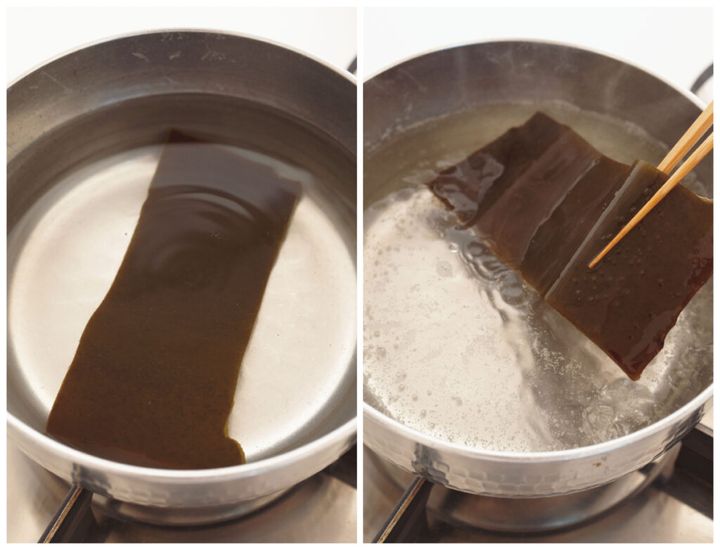昆布を水に浸しておくことで、味を引き出しやすくします。また沸騰直前に昆布を取り出すのは、うまみが出るのが65〜85℃だから。沸騰した状態に入れたままにしておくと、ぬめりが出てしまうんです。