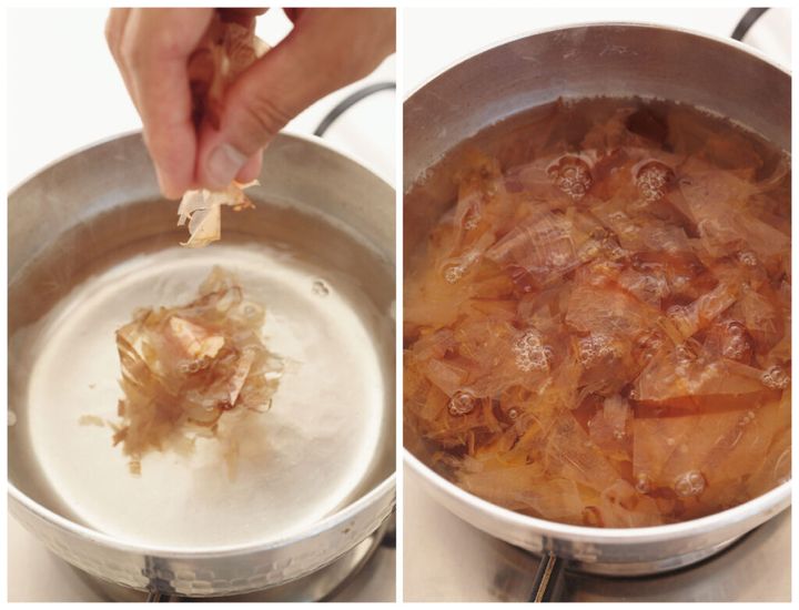沸騰しただし汁をしばらくおき、削り節のうまみが出る85℃くらいまで温度を下げます。削り節をひとつまみ加えると、ゆっくりと底に沈む状態が適温です。