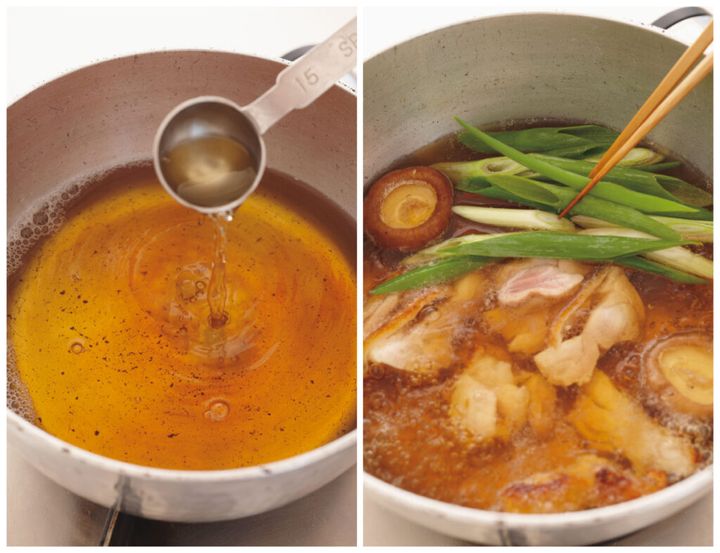 (5)大きめの鍋にたっぷりの湯を沸かし、そばを入れて袋の表示どおりにゆではじめる。別の鍋にだし汁を入れて中火にかけ、そばつゆ用の材料を加える。煮立ったら、鶏肉、しいたけ、わけぎの順に加える。