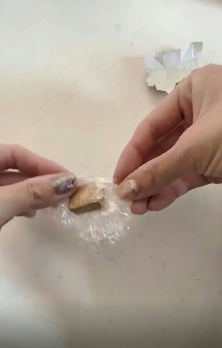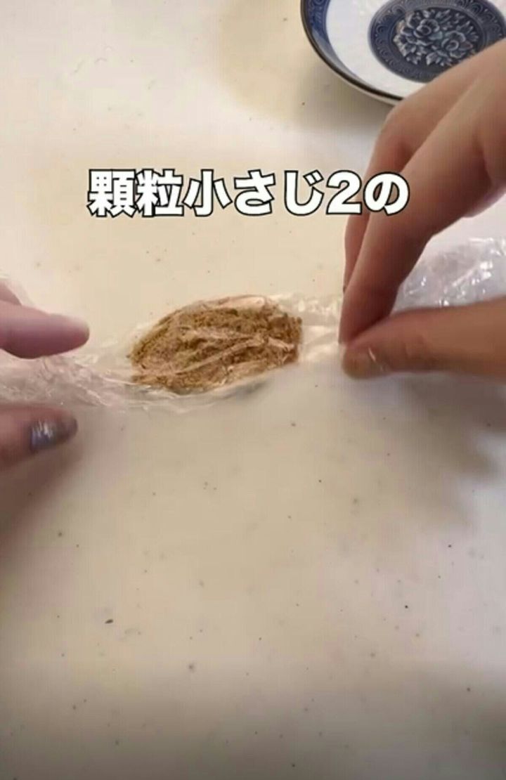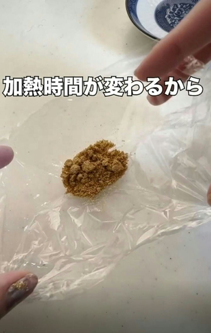 加熱後、ラップに包んだコンソメを取り出して、ラップから出さずにそのままの状態でラップの上から指を使ってコンソメをつぶしていきます。