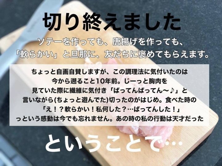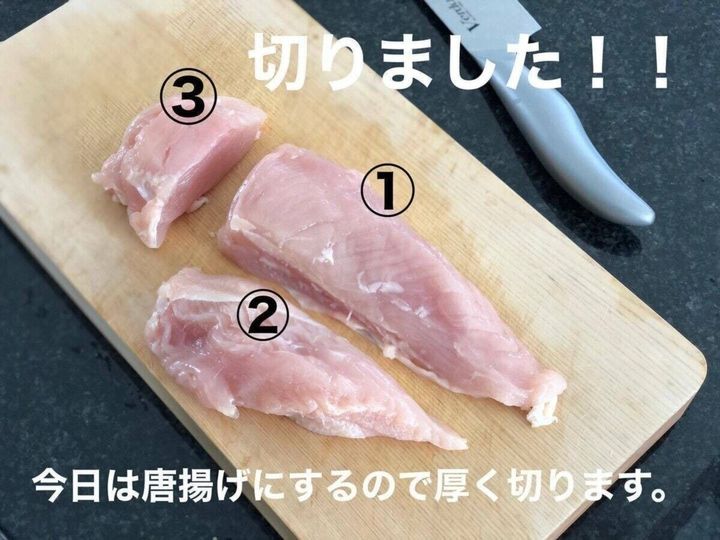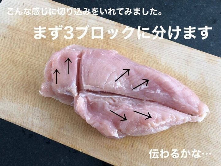 ソテーを作るときも、揚げ物を作るときも、この切り方で柔らかく仕上がるようです。切り方を工夫するだけで、他に何も手を加えずとも胸肉が柔らかくなるとは驚きですよね。