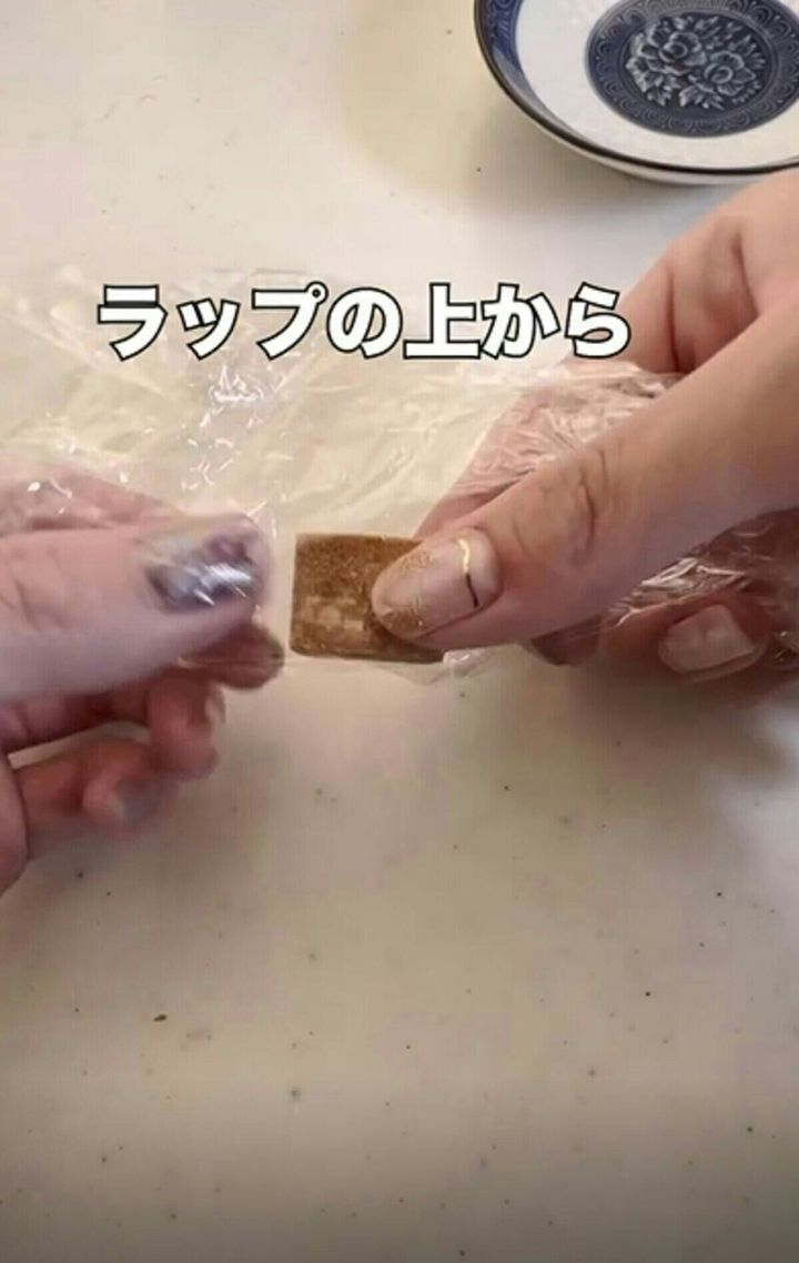 固形コンソメを1個取り出し、ラップの上に置きます。そして、ラップで包みます。