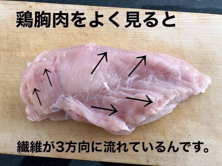鶏胸肉には、繊維があることをご存じですか?その繊維は3つの方向に流れているようです。