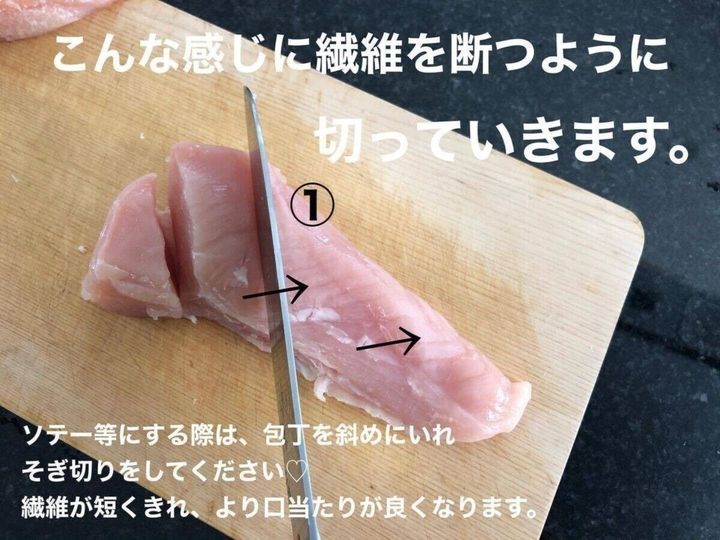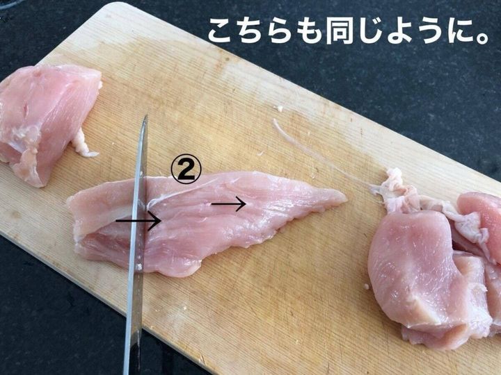 今後は、鶏胸肉をよく見て、繊維の方向を考えてカットすることを覚えておきましょう。