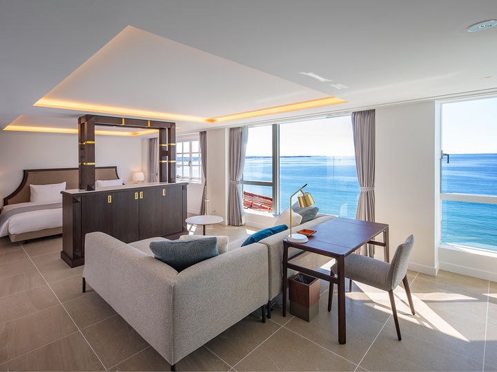 2023年11月にリニューアルオープンし、全室がスイートルームへと進化。ホテルは高台に位置しているため、客室の大きな窓から見下ろす相模湾は圧巻の迫力だ。
