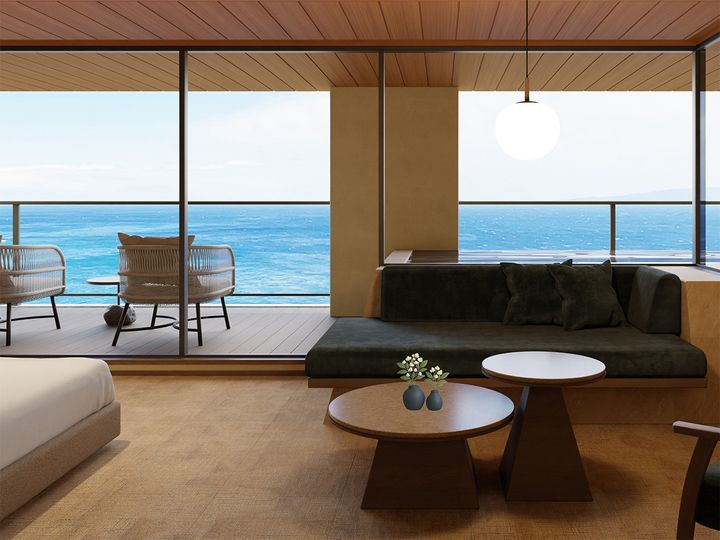 「ノスタルジック・ラグジュアリー」をテーマに2025年11月に開業。全16室がオーシャンビューで源泉掛け流しの露天風呂が付いている。「スタンダード」でもベッドからもお風呂からも海の絶景を望む。