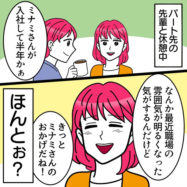 先輩「最近職場の雰囲気が明るくなった気がするんだけど、きっとミナミさんのおかげだね!