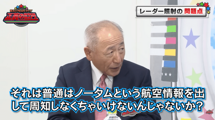 30分間レーダーを照射した今回は「捜索レーダーだと30分集中的にやる必要はないわけですよね。やっぱり、狙ってるということですよね」と解説する。さらに、「僕はおそらく戦闘機の方は警報が鳴って射撃管制レーダーが照射されたという、そういう証拠もつかみ判断もしたと思います」と語った。