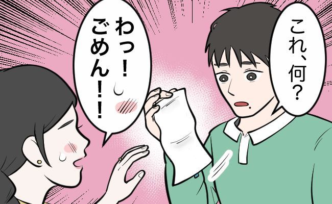 夫の手には、何やら見覚えのある紙が……。「トイレの床に落ちてたんだけど……何これ?」。