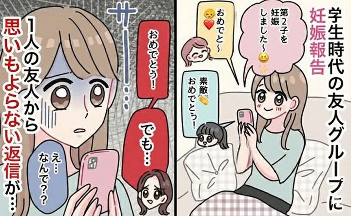 30代前半、2人目の妊娠がわかったときのお話です。妊娠や出産をすると、学生時代の友人たちに連絡するながれになっていたので、私もグループメッセージで連絡したのですが……。