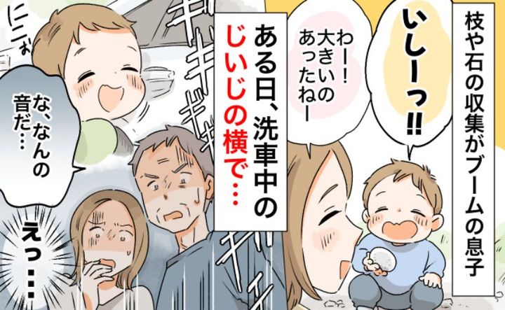 車好きの父が洗車している隣で、息子はいつもの収集を始めました。父が車にワックスをかけ、ピカピカに拭き取りをしていると突然、車の反対側から「ギギギギギーーー」っと鈍い音が……。