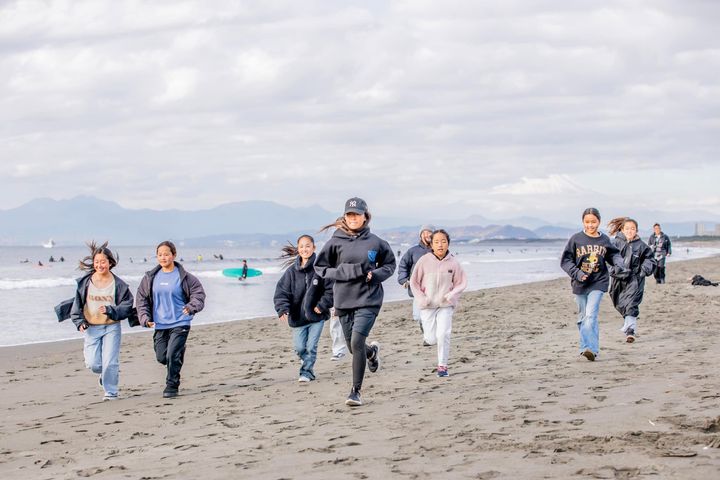少し寒かった鵠沼海岸。ビーチクリーンをしたりアップで走ったりして、親睦を深め、子どもたちの心と体をほぐした
