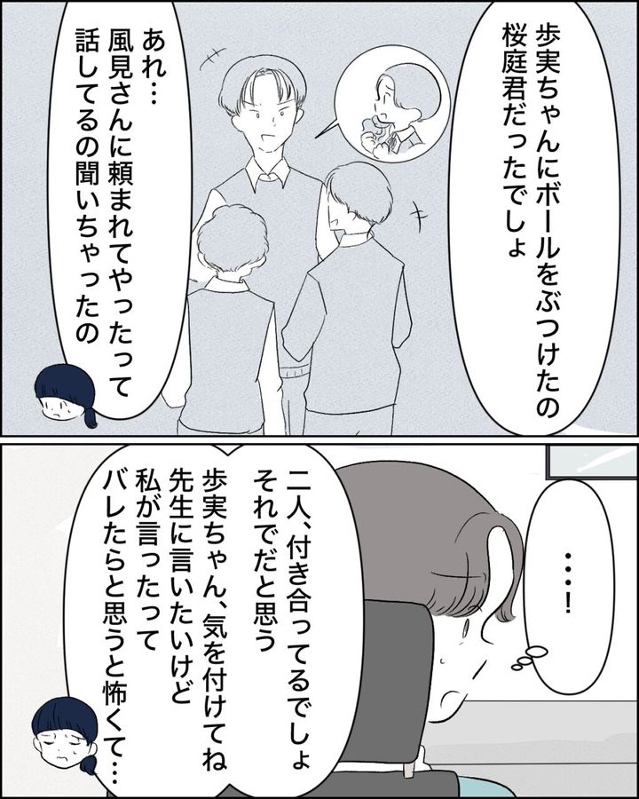 「二人、付き合ってるでしょ、それでだと思う。歩実ちゃん、気をつけてね。先生に言いたいけど、私が言ったってバレたらと思うと怖くて・・」と申し訳なさそうな様子のカナちゃんを見て、