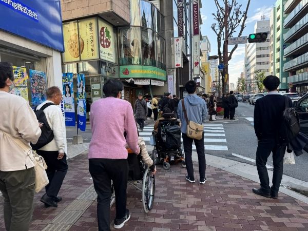 試写会前には、車いすの方と、車いすに乗った健常者の方が、天神のワンビルからキノシネマ天神まで町歩きをする車いす体験イベントが行われました。