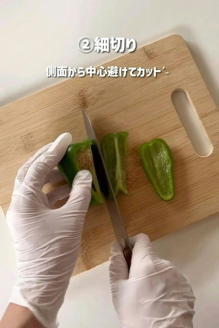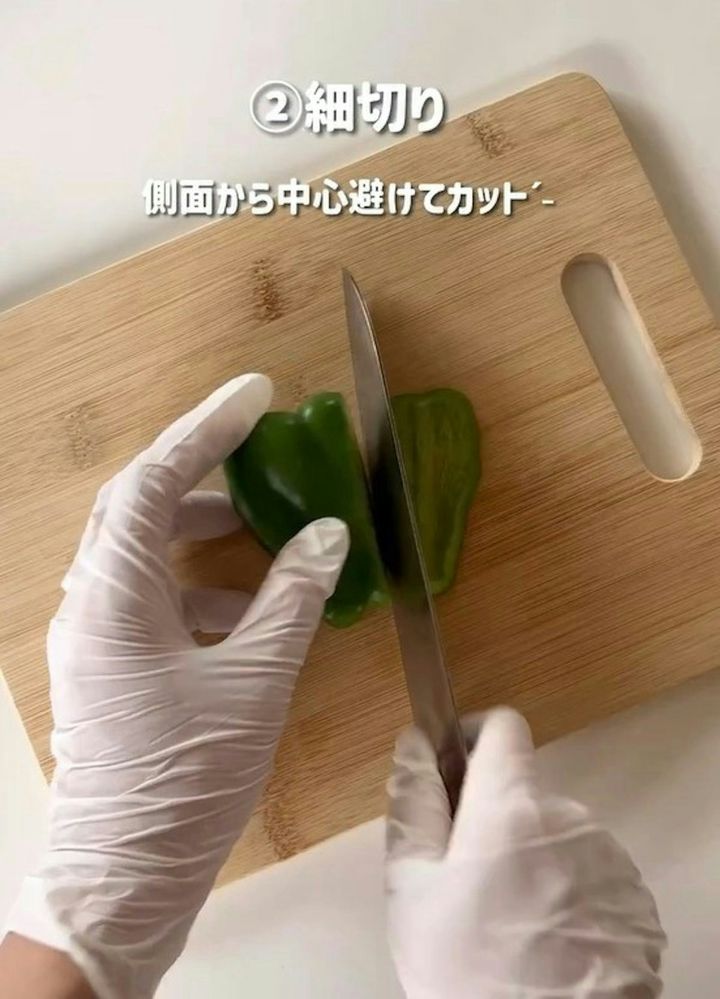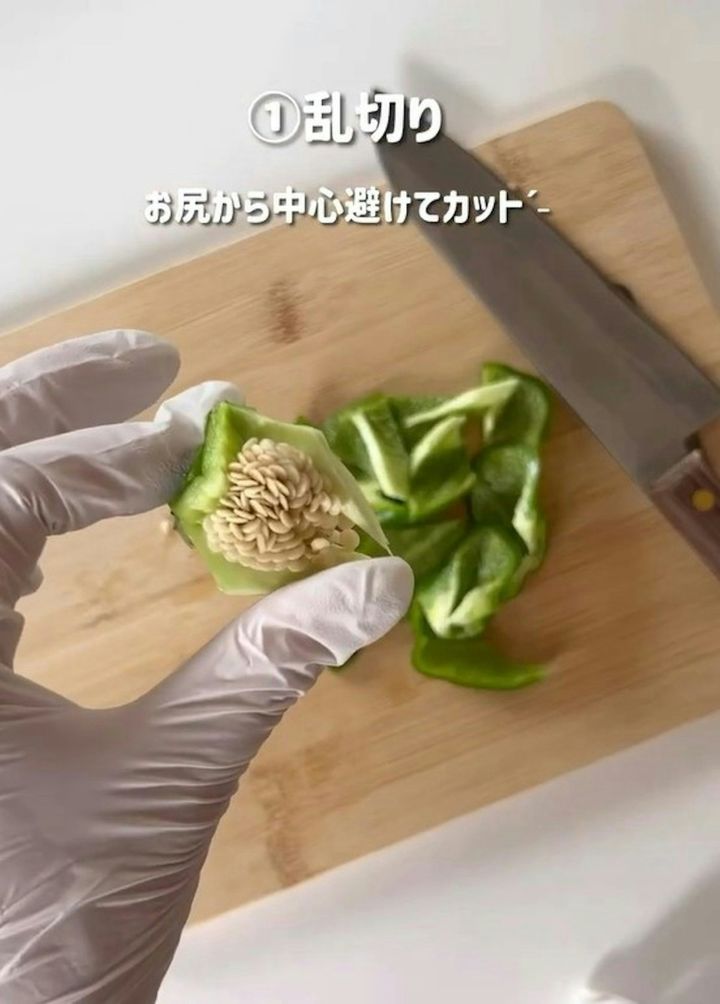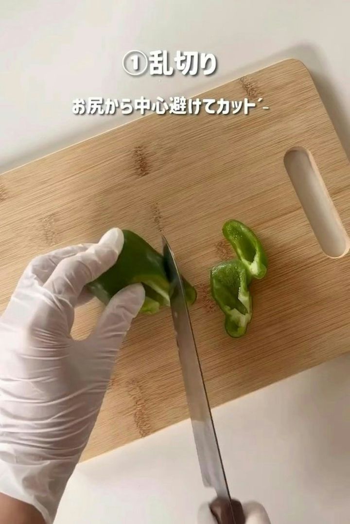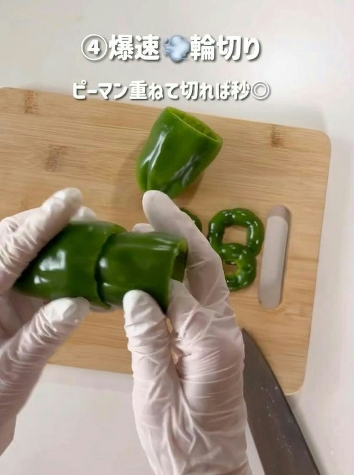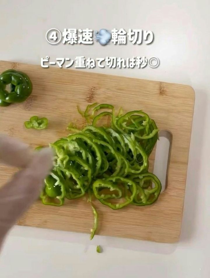 ピーマンの空洞がある形を生かした裏技ですね。空洞にピーマンを重ねることで、力も入れやすくカットしやすくなりそうです。