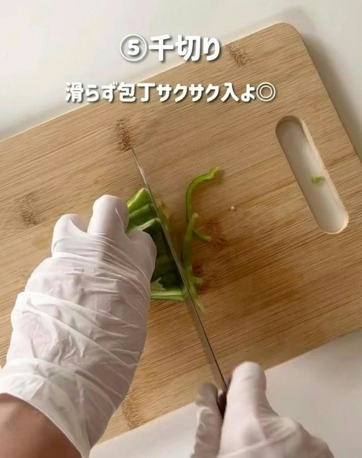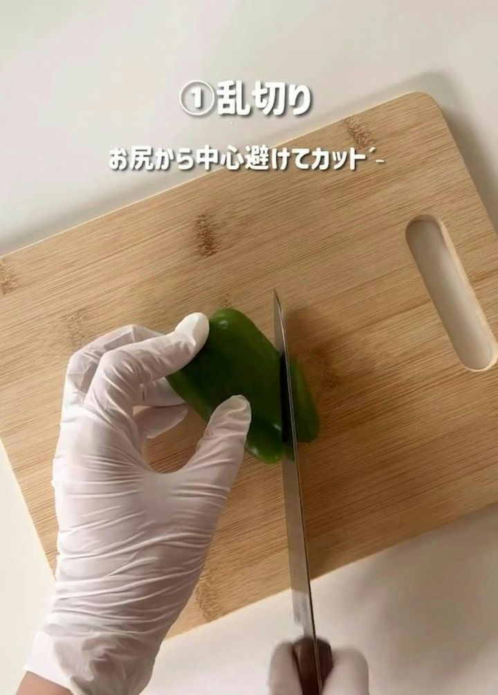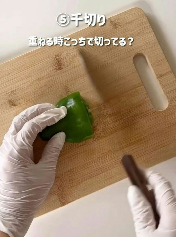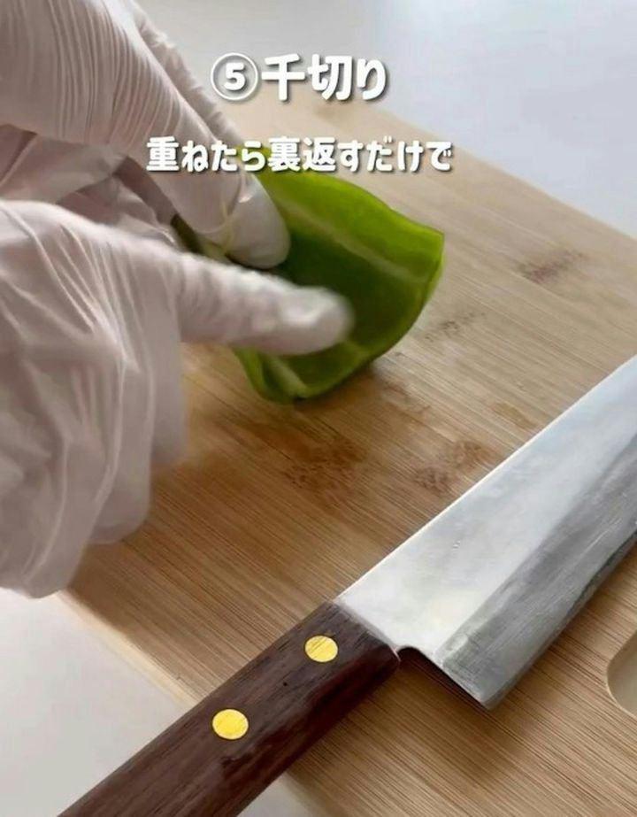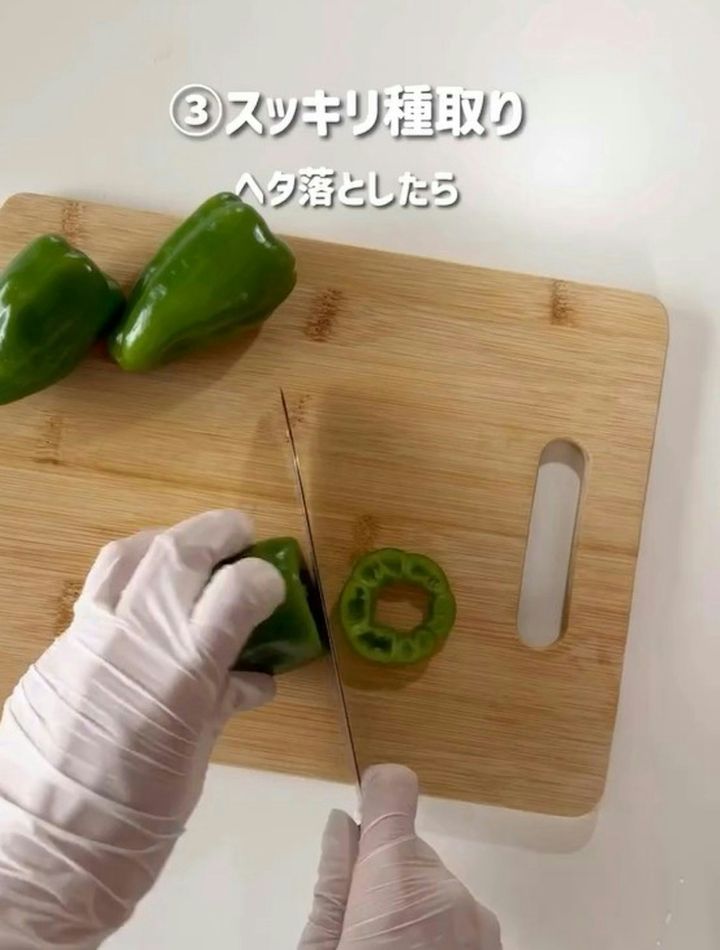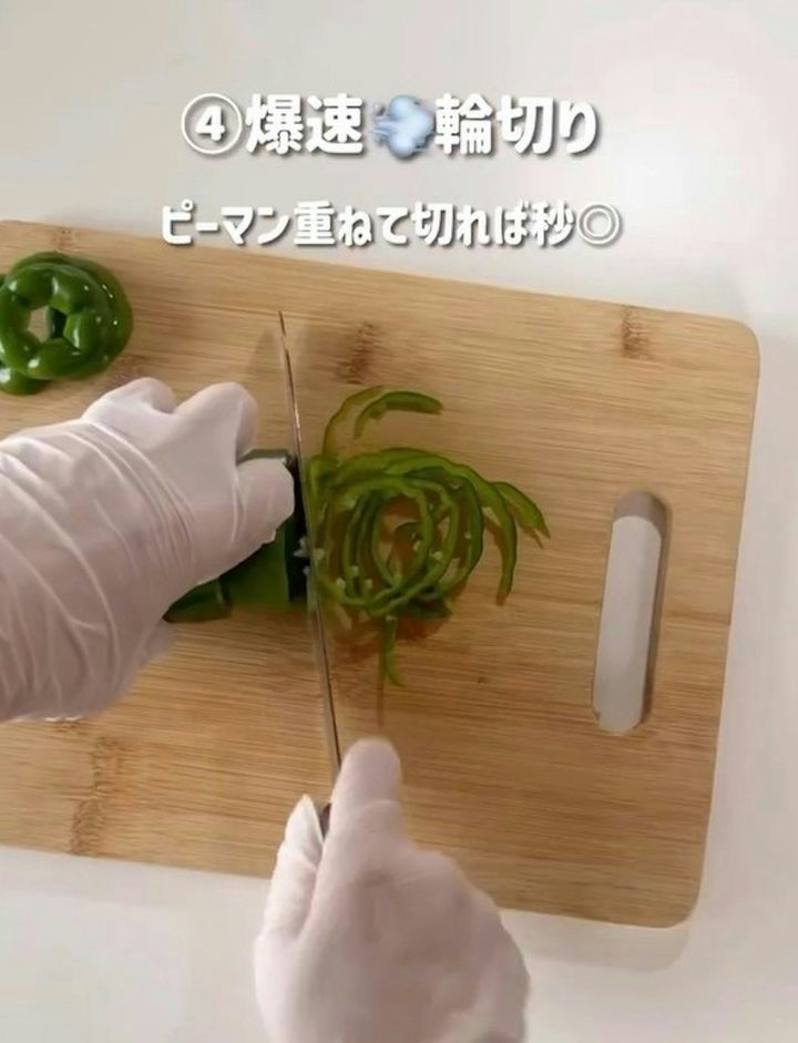 ピーマンの空洞がある形を生かした裏技ですね。空洞にピーマンを重ねることで、力も入れやすくカットしやすくなりそうです。
