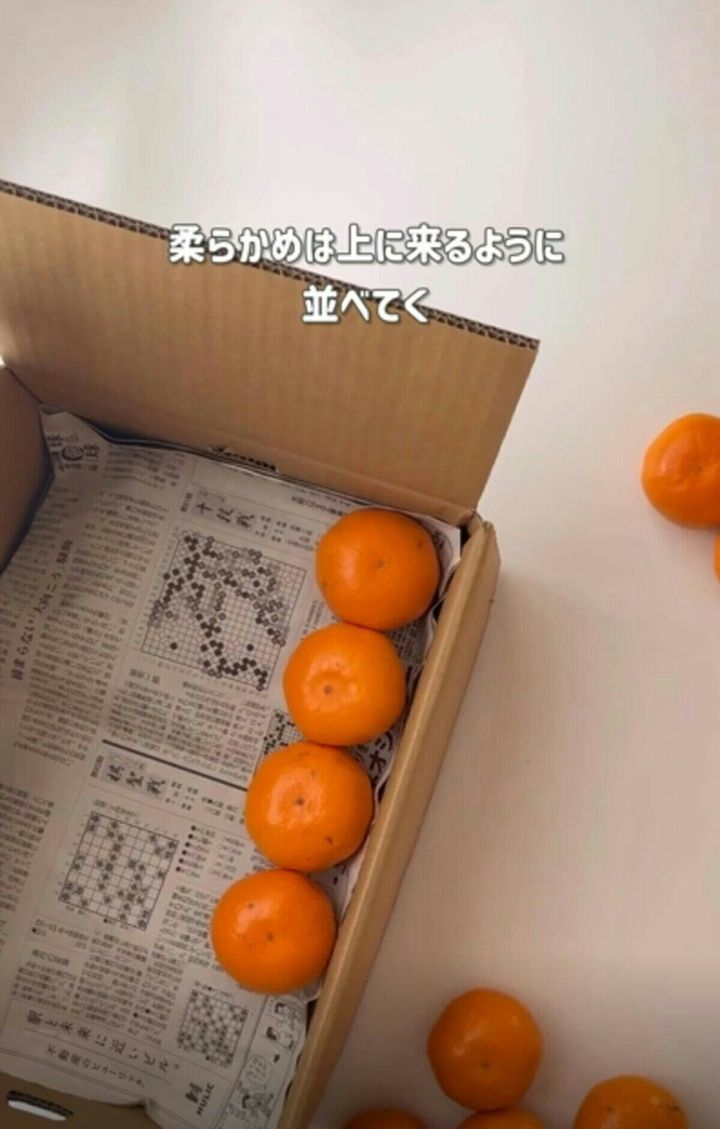 その新聞紙の上に、柔らかめのみかんを重ならないように気を付けて並べていきます。