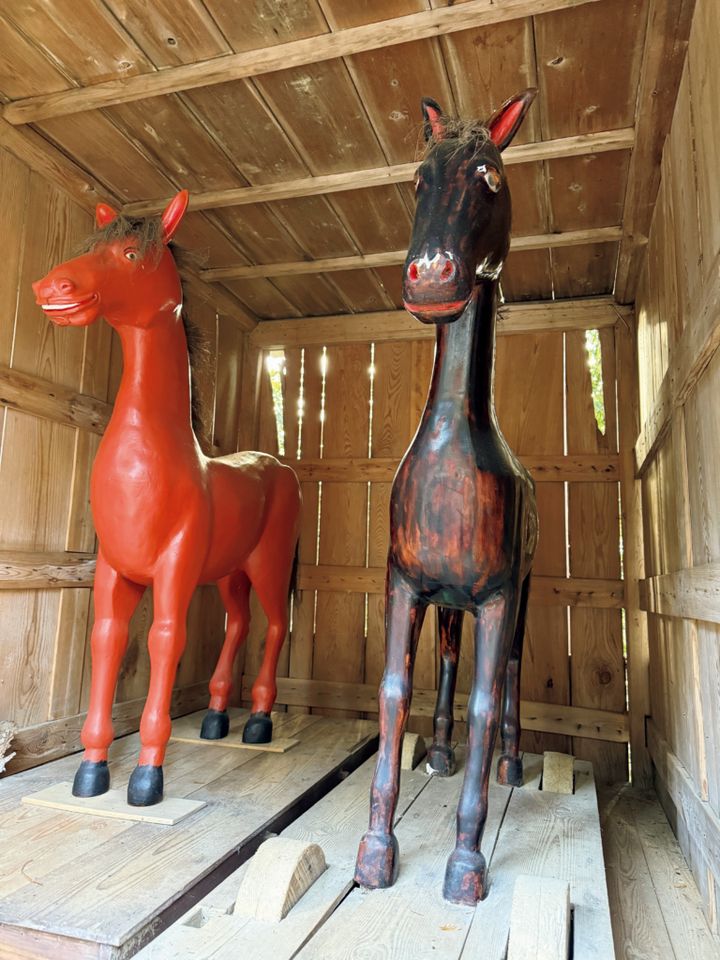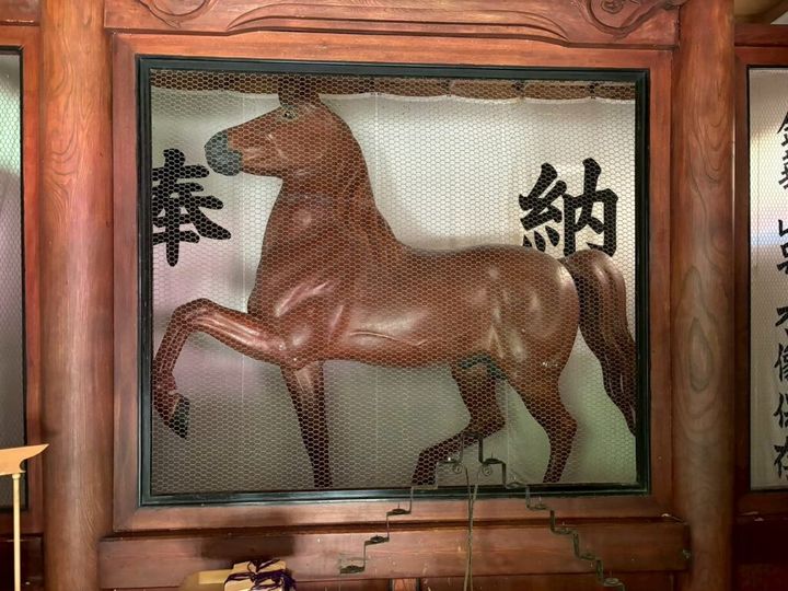 主馬神社に納められた金華山号の等身大の木彫り。開帳は9月の御例祭のときのみですが、ガラス扉越しに見られます。