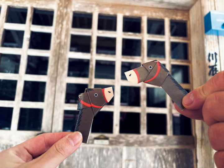 馬形に折られたおみくじも。ふだんは無人で、拝殿前におみくじや御朱印が置かれています。うまみくじ初穂料300円。