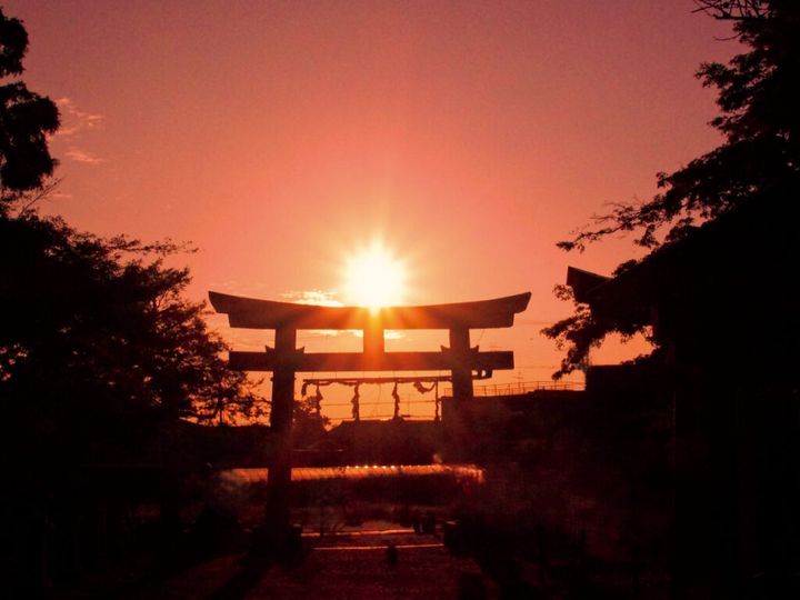 11月半ばから2月半ばにかけて、鳥居に沈む夕日が境内から見られます。陰陽道によって、本殿が南西(裏鬼門)を向いて建てられたがゆえの珍しい光景です。