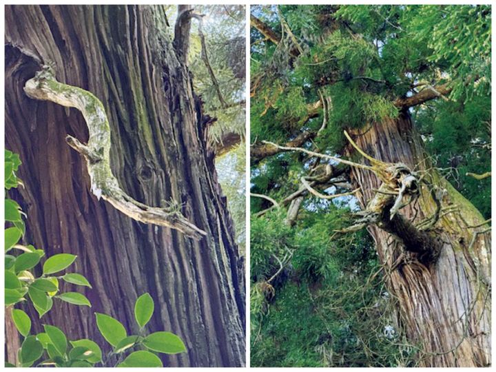 御神木の折れたところから辰年に龍(右)、巳年に蛇(左)のような枝が生えたという不思議な話が。辰・巳・午の干支が続いて縁起がいい!