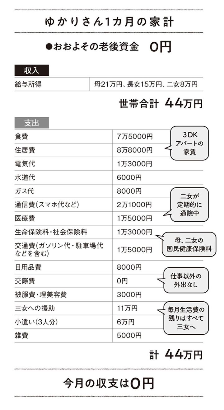 プロダンサーを目指す三女を家族で応援し、「生活費の残りは全額三女に仕送り、休日は家事を手伝っています」。会社員の長女を除き、ゆかりさんと、心療内科に通いながらアルバイト中の二女は年金保険料未納の状況。