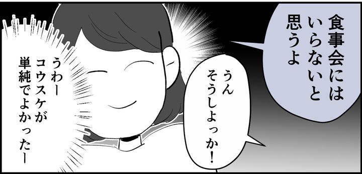 幸い、コウスケも私の考えを理解してくれ、食事会自体は終始和やかな雰囲気のまま終わりました。