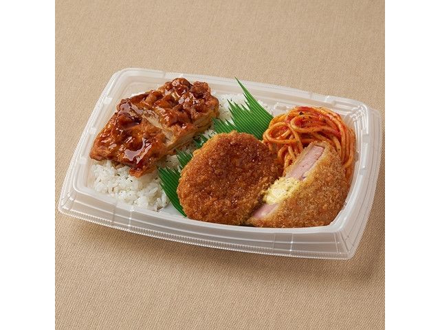 甘辛鶏から揚げ、厚切りハムカツなどを使用した肉系おかずのお弁当です。 ※宮崎県、鹿児島県では取り扱いがございません。
