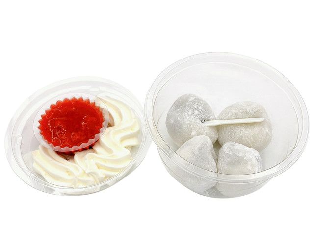 食べ方はお客様次第、こしあん大福をそのまま、ホイップクリームだけディップ、苺ソースだけディップ、全部ディップしても美味しい。1食で何度でも楽しめる新しい大福。 カロリー:275kcal 【販売地域】東海