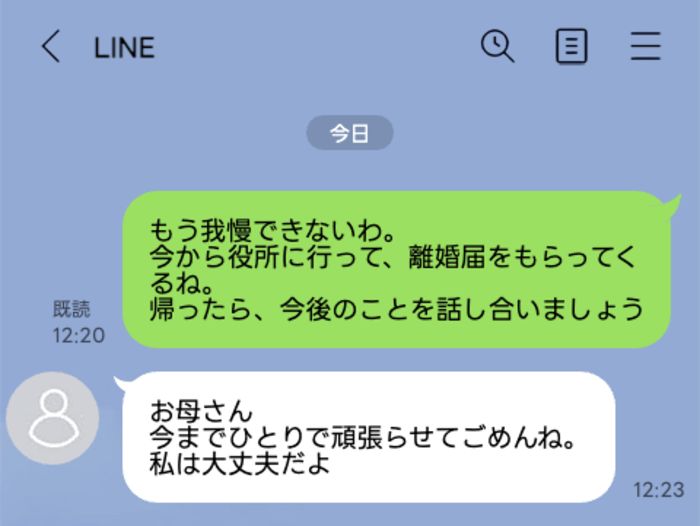 「もう我慢できないわ。今から役所に行って、離婚届をもらってくるね。帰ったら、今後のことを話し合いましょう」