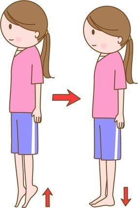 (2) かかとを上げてつま先立ちをして5秒キープしたら、かかとを下ろす(イラスト)
